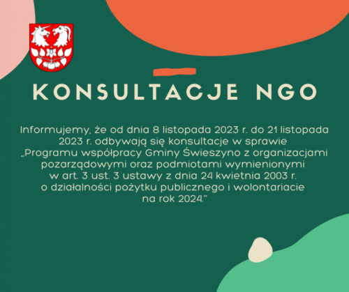 Informujemy, że od 8 listopada 2023 r. do 21 listopada 2023 r. odbywają się konsultacje społeczne w sprawie „Programu współpracy Gminy Świeszyno z organizacjami pozarządowymi oraz podmiotami wymienionymi w art. 3 ust. 3 ustawy z dnia 24 kwietnia 2003 r. o działalności pożytku publicznego i o wolontariacie na rok 2024”.