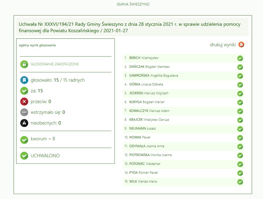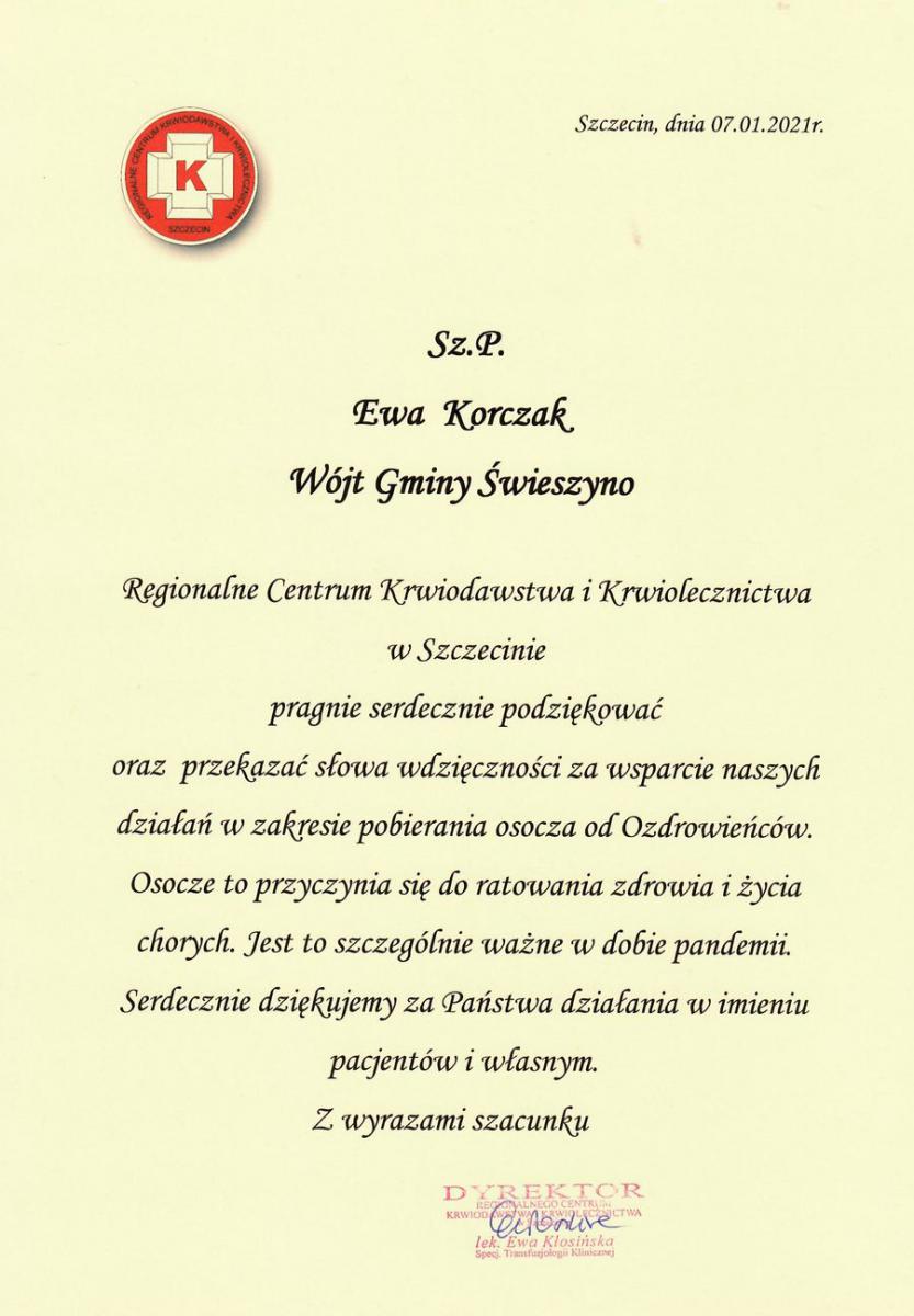Bardzo dziękuję Radnym Rady Gminy Świeszyno, którzy podczas ostatniej sesji Rady Gminy w dniu 28 stycznia jednogłośnie zdecydowali o udzieleniu z budżetu gminy pomocy finansowej w wysokości 10 000,00 złotych na zakup separatora komórkowego MCS+ dla Oddziału Terenowego Regionalnego Centrum Krwiodawstwa i Krwiolecznictwa w Koszalinie, w związku z działaniami mającymi na celu przeciwdziałanie skutkom rozprzestrzeniania się koronawirusa SARS-Cov-2.