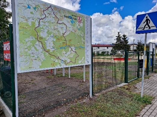 Przedmiotem zadania jest budowa centrum turystyczno-rekreacyjnego w Świeszynie co ma na celu zaspokojenie potrzeb lokalnej społeczności, rozwój niekomercyjnej i ogólnodostępnej infrastruktury rekreacyjnej i turystycznej poprzez stworzenie miejsca bezpiecznego dla mieszkańców. Nowo powstałe centrum turystyczno-rekreacyjne zostało wzbogacone o nowe elementy małej infrastruktury technicznej takie jak: stół do gry w piłkarzyki, piaskownica metalowa, ławki metalowe z oparciem, dwa zestawy pięciu koszty przystosowanych do selektywnej zbiórki odpadów, tablica turystyczna z mapą Gminy Świeszyno oraz tablica edukacyjna. Ponadto centrum turystyczno-rekreacyjne w Świeszynie zyskało nowe, panelowe ogrodzenie oraz dokonano wymiany bądź uzupełnienia nawierzchni.