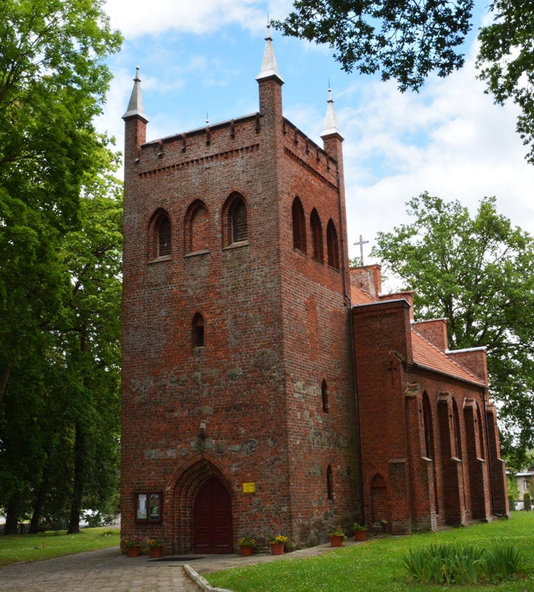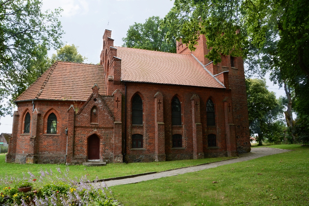 wysadzony w powietrze przez wojska radzieckie. Inni mówili, że miejscowi ludzie wycinali z tego kościółka belki do palenia w piecach i tak, pewnej nocy, podczas wielkiej wichury, kościół zawalił się. Cegły z tej budowli zostały zużyte do budowy remizy strażackiej w Świeszynie. Z kościoła zachowały się 2 fotele z herbem jego fundatora- Kartza von Kamecke i kielich mszalny. Obie pamiątki znajdują się w obecnym kościele, który został wybudowany prawie na miejscu poprzedniego.