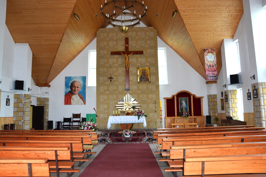 Dopiero w 2007 roku staraniem śp. księdza proboszcza Andrzeja Bujara, pana Stanisława Konopackiego i pracownika konserwacji witraży – Krzysztofa Mazurkiewicza, odnowiono dwa piękne okna. Witraże przedstawiają Świętą Rodzinę w stajence i Jezusa zmartwychwstałego z grobu. U dołu umieszczono herb fundatora i jego inicjały, a także kwiat konwalii (poświęcony Marii z Nazaretu) często umieszczany na ołtarzach, księgach liturgicznych, wizerunkach świętych. Kościół zbudowany jest z cegły i kamieni polnych, orientowany z prezbiterium niewyodrębnionym zakończonym prosto.